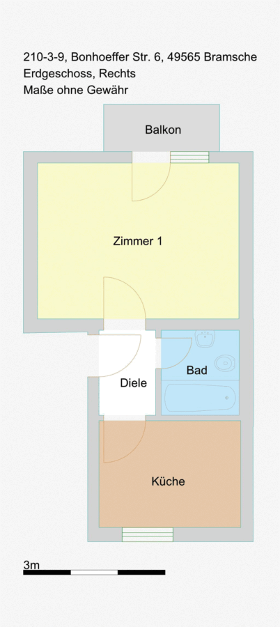 Diese gemütliche Singlewohnung befindet sich im Erdgeschoss eines Mehrparteienhauses in der Bonhoeffer Straße 6 in 49565 Bramsche. Mit einer Wohnfläche von 26,46 m² bietet die Wohnung ein kombiniertes Wohn-/Schlafzimmer mit Zugang zum Balkon, eine separate Küche, ein Badezimmer mit WC und Dusche und den Flur.