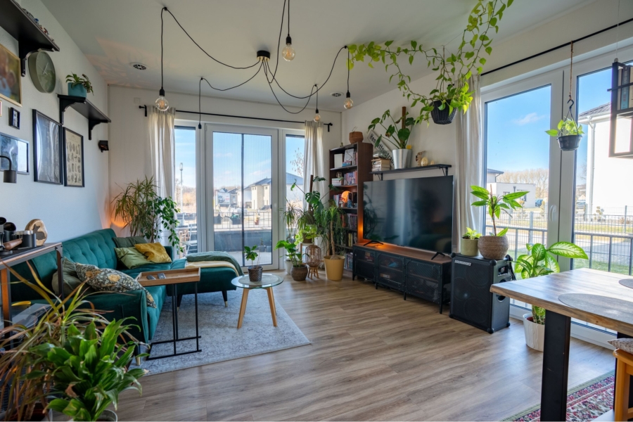 Die zurückhaltend schlichte Inneneinrichtung besteht aus einem pflegeleichten und ökologisch unbedenklichen Vinyl-Bodenbelag und einer hochwertigen Einbauküche mit Induktionsherd. Die Küche bietet alle gängigen Einbaugeräte in optimaler Energieklasse. Eine kontrollierte Wohnraumlüftung mit Wärmerückgewinnung sorgt für einen ständigen, automatischen und hygienischen Luftwechsel.